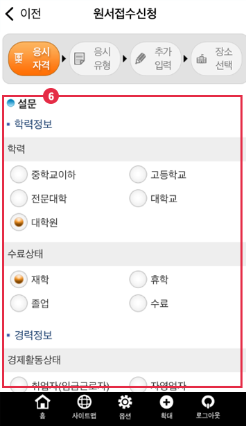 학력 , 수료상태 , 경제활동상태, 응시목적,